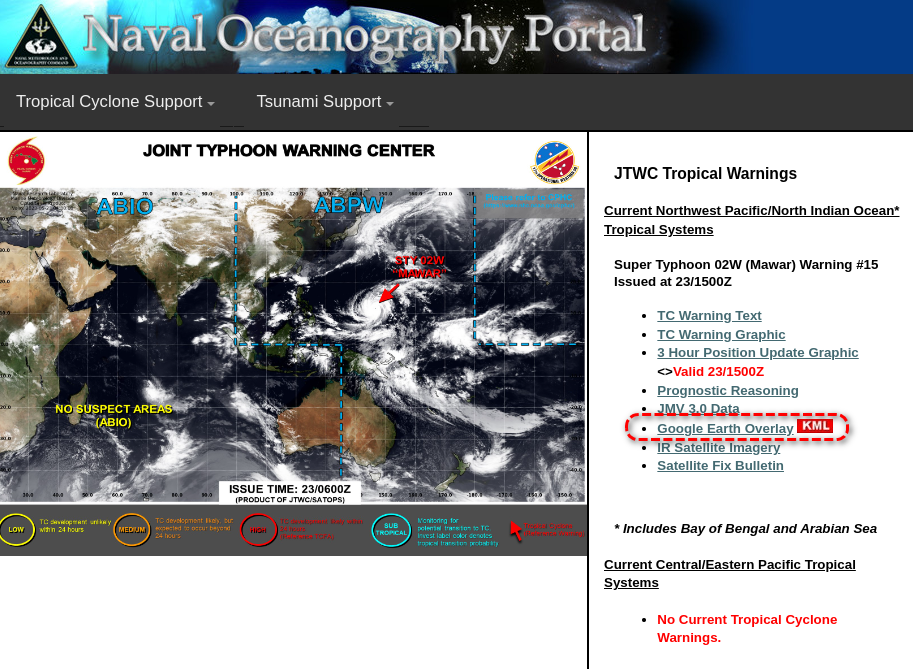 혹시 자신이 거주하는 국가 및 도시를 태풍이 통과할 것으로 예상된다면 Naval Oceanography Portal에서 태풍의 Google Earth Overlay 파일을 다운로드해 확인하는 방법이 있습니다.