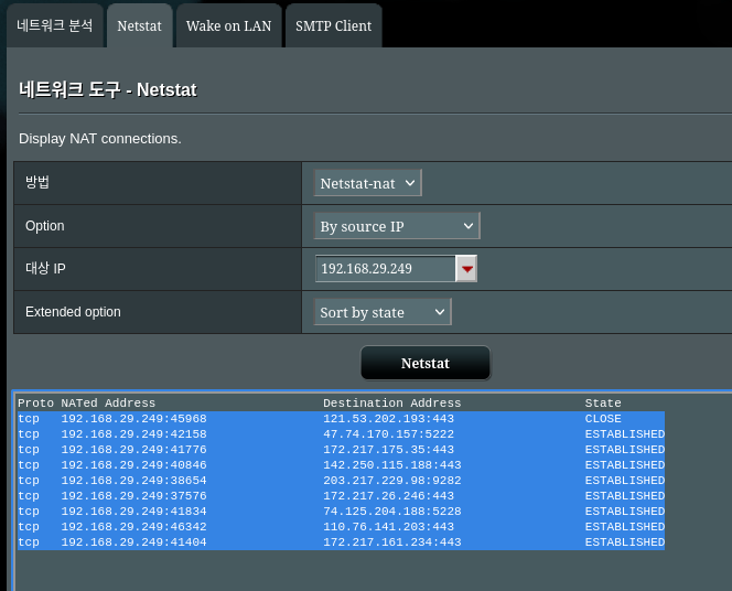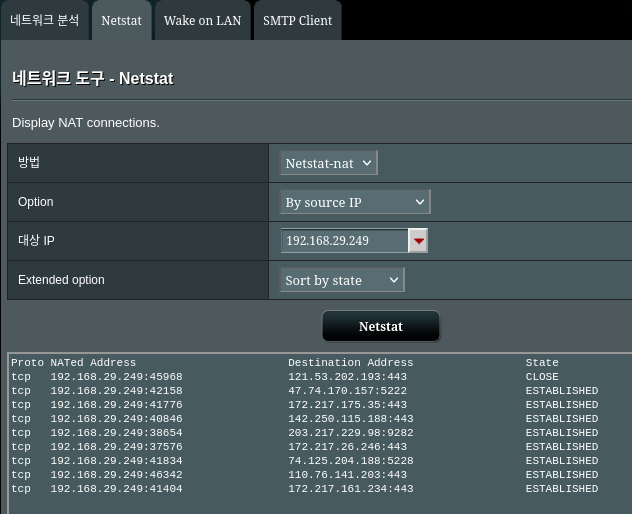 공유기 관리자모드 - 네트워크 분석 - Netstat 메뉴를 통해서 확인할 수 있습니다.