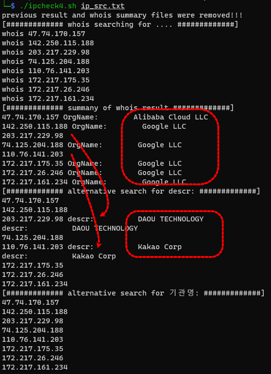 kakao Corp, Daou technology의 경우 descr: 및 기관명에서 추출이 되기 때문에 좀 shell script가 지저분한 점 널리 양해 바랍니다. 제가 그냥 개인적으로 사용하려고 만든 것이라 script가 지저분할 수 있습니다.