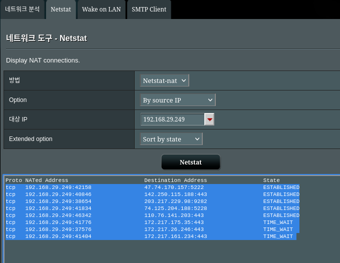 Netstat - Netstat-nat를 선택하고, By source IP, 휴대폰의 IP를 선택하고 Netstat를 누르면 휴대폰에 연결된 IP가 나오게 됩니다. 여기서 중요한 IP들은 State에 "ESTABLISHED'로 나오는 IP LIST입니다.
