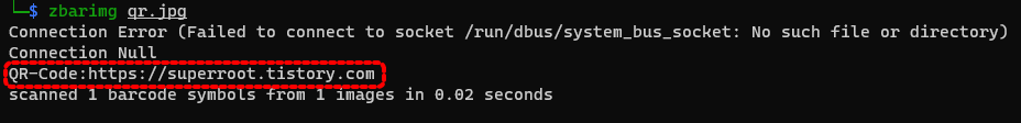 QR CODE가 있는 사진을 zbarimg 프로그램을 사용하여 확인하면 자동으로 QR-Code:에 연결된 URL 주소가 DECODE 됩니다.