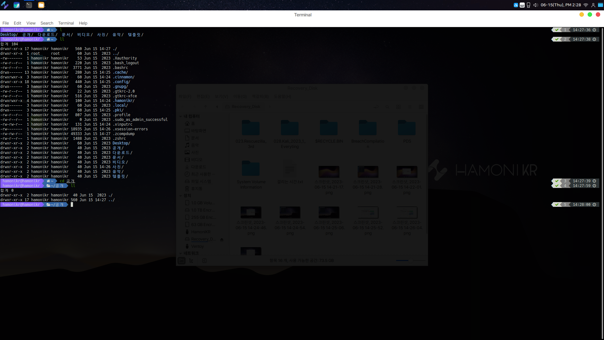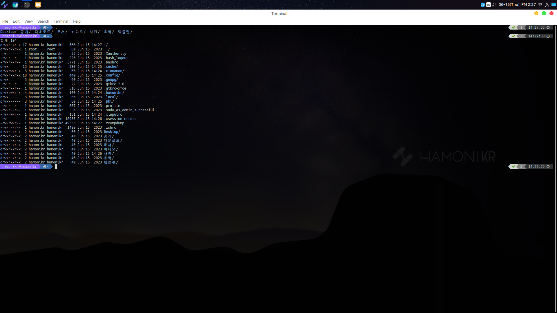 하모니카 운영체제의 터미널 역시 좀 이쁩니다. 기본적으로 zsh로 사용하며 감각 있는 컬러가 잘 어울리는 터미널 환경입니다.