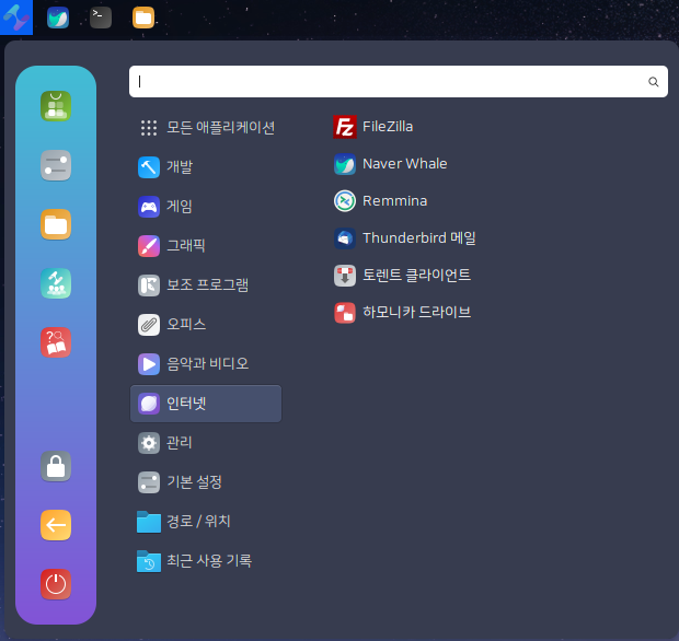 인터넷 메뉴에는 FTP 프로그램인 FileZilla, 인터넷 브라우저 Naver Whale, RDP Client Remmina가 기본 설치되어 있습니다. 진짜 딱 필요한 프로그램들이 다 있습니다.