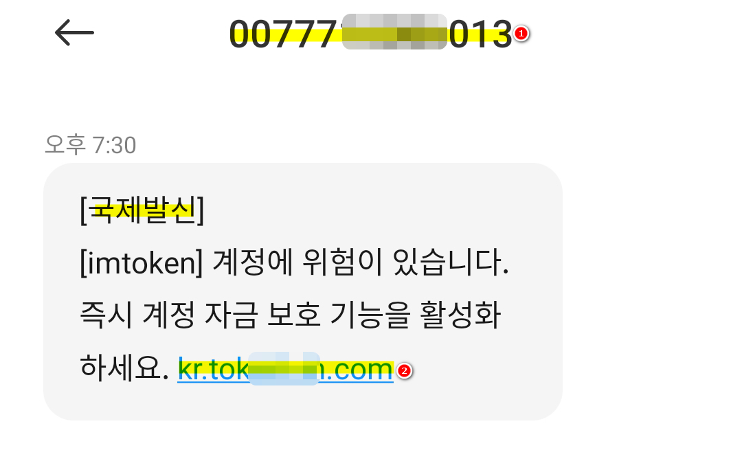 제가 받은 문자는 이미 스팸으로 90번 넘게 신고된 번호였습니다. 댓글을 보니 imtoken, 바이낸스를 비롯하여 아주 다양한 스미싱 문자를 보내는 번호가 확실하네요.