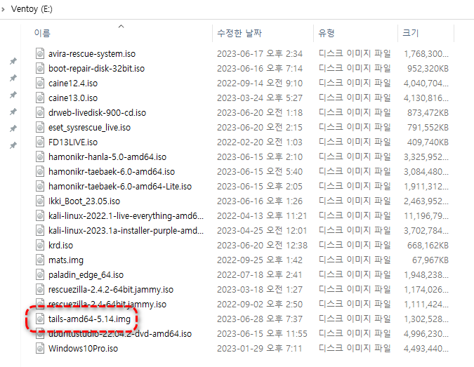 필요한 준비물은 USB, Ventoy 프로그램, tails 최신 img 파일.