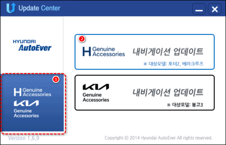 프로그램을 실행하고 Hyundai AutoEver 이미지 아래쪽에 있는 H Genuine Accessories KN Genuine Accessories 이미지(1번)을 클릭합니다. 저 이미지를 클릭해야 포터 2 내비게이션을 업그레이드할 수 있는 H Genuine Accessories 내비게이션 업데이트가 나옵니다.