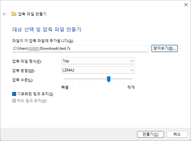 [찾아 보기]를 눌러 압축 파일이 저장될 위치와 파일 이름을 지정합니다. 압축 파일 형식은 7zip을 선택하는 것이 좋습니다. 보통 zip 용량보다 더 적은 용량으로 압축할 수 있습니다.
