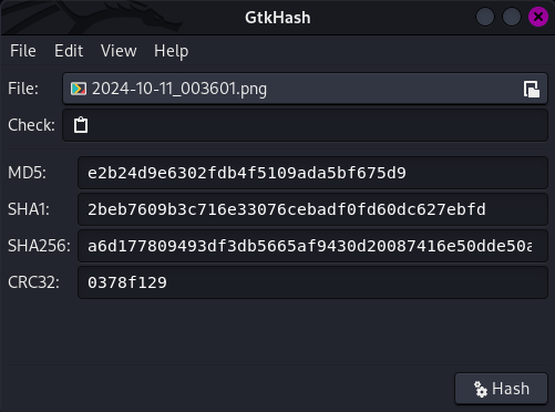 리눅스 프로그램 중 GtkHash라는 프로그램도 활용하기 좋습니다. Check 필드에 확인하려는 Hash 값을 붙여넣기 하고 [Hash]를 누르면 파일의 Hash 값과 비교하여 일치 여부를 알려주는 프로그램입니다.