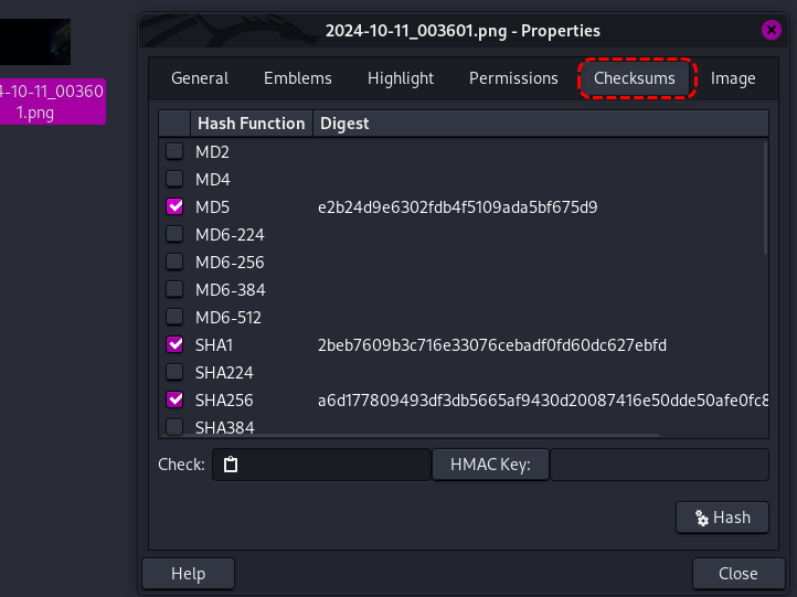 Kali Linux의 기본 파일 탐색기인 Thunar에서는 파일을 선택하고 [마우스 오른쪽 클릭] - [Properties] - [Checksums] 메뉴를 선택하여 손쉽게 파일의 Hash 값을 확인할 수 있습니다.