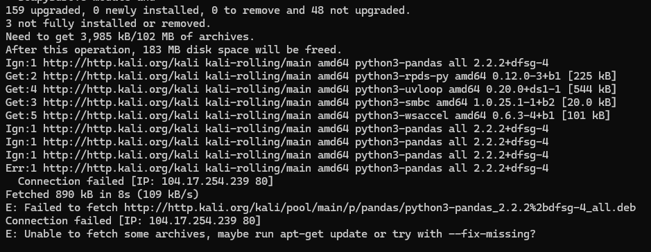 Repo.에서 일부 패키지를 다운로드할 수 없는 상태는 아래의 사진과 같습니다. Failed to fetch ~ 이런 식으로 시작되며 패키지 이름이 나오는데, 그 패키지가 Repo.에 제대로 없어서 이런 문제가 발생합니다.