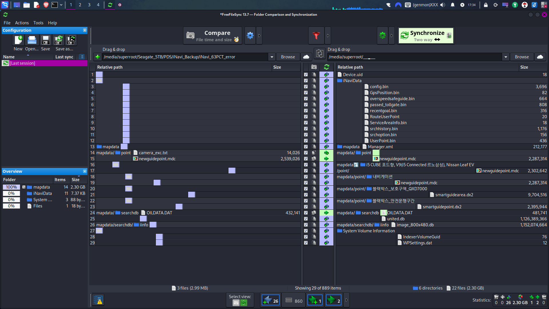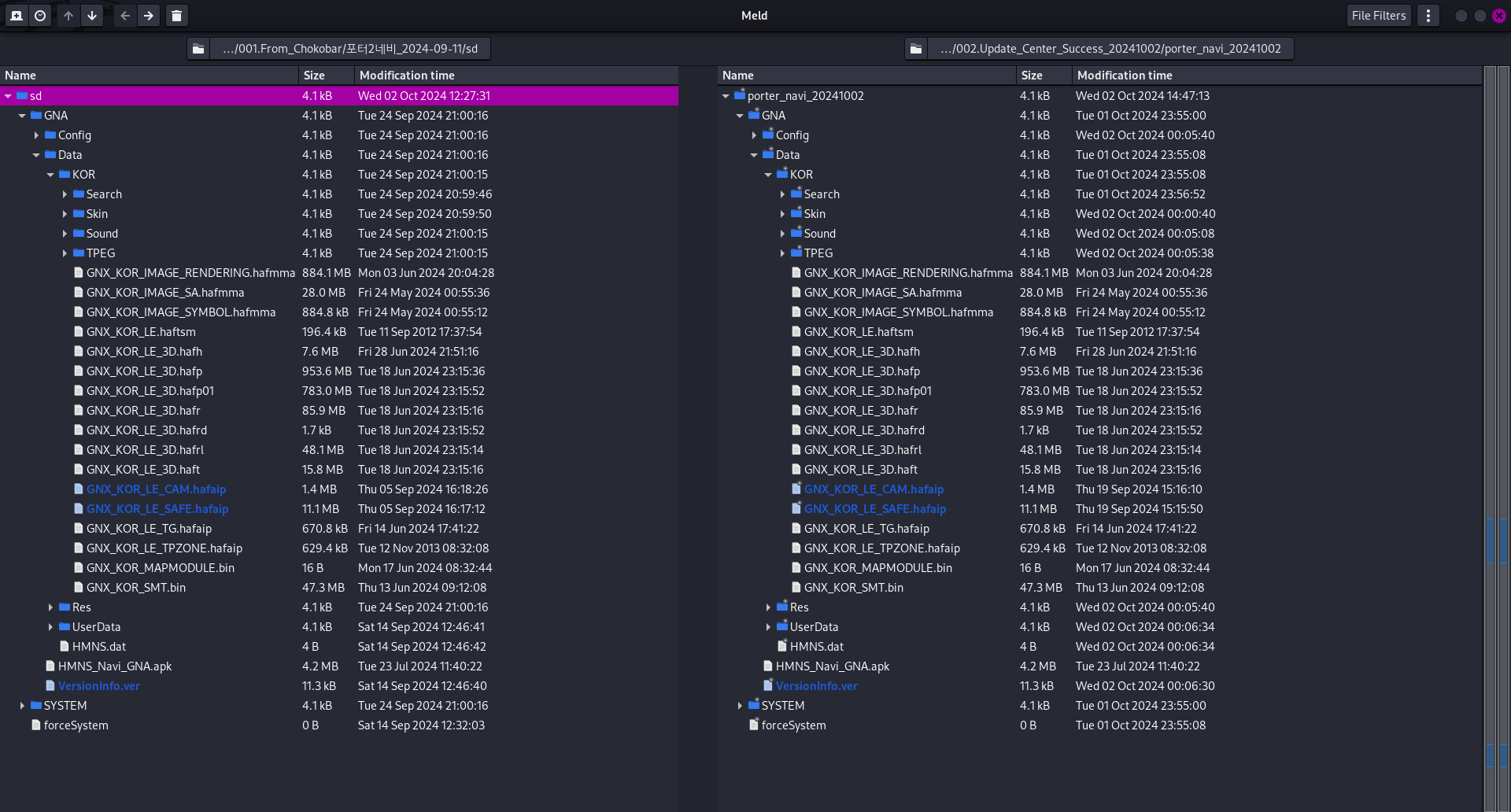 kdiff3 프로그램 역시 2개, 또는 3개의 폴더를 비교하기 좋은 프로그램입니다. 파일 단위의 변경 내용을 확인하기 좋은 프로그램인데 내비게이션 SD 카드의 변경 내용을 확인하기에도 좋습니다. 파일 자동 동기화 기능은 부적절하기 때문에 kdiff3 프로그램에서는 단순히 변경사항 확인 용도로 사용해 주세요.