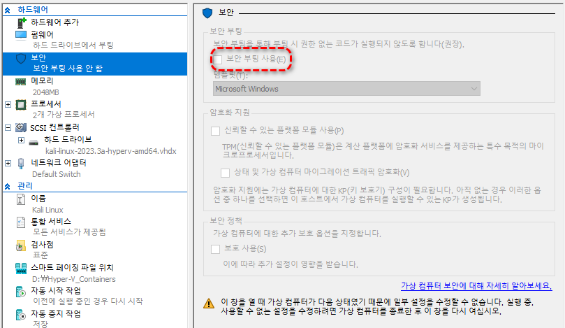 새 가상머신 기본 설정이 완료되면 가상 머신의 설정으로 들어가서 [안전 부팅 사용 안 함]으로 바꿔주셔야 합니다.
