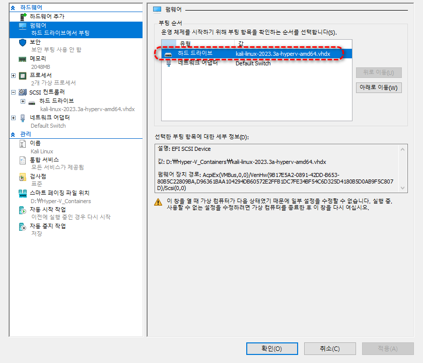 펌웨어 - 하드 드라이브에는 다운로드 한 Kali linux vhdx 파일이 선택되었는지 확인하세요.