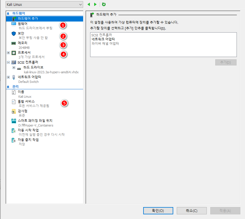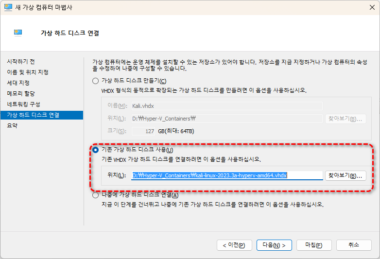 [가상 하드 디스크 연결] 메뉴에서는 [기존 가상 하드 디스크 사용]에서 [찾아보기]를 눌러 다운로드한 kali linux의 vhdx 파일을 선택하시면 됩니다. 앞으로 이 vhdx 파일을 계속 사용해야 하기 때문에 적절한 디렉터리에 이동시켜서 사용하시는 것이 좋습니다. 제 경우에는 D 드라이브 Hyper-V_Containers라는 디렉터리를 만들어 가상머신 vhdx 파일을 모두 관리하고 있습니다.