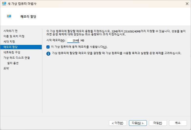 시작 메모리는 기본적으로 4096 MB로 자동 설정되지만, 최소 2048로 설정해서 진행하셔도 됩니다. 시스템의 메모리가 여유가 많다면 4096으로 그냥 두시고, 최소 메모리로 줄이려면 2048로 설정하여 사용하세요.