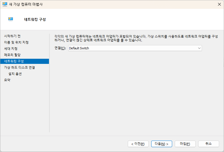 네트워킹 구성에서는 Default Switch를 선택하시면 됩니다. Default Switch는 외부 인터넷을 사용할 수 있는 네트워크 스위치로 Windows 컴퓨터(Host PC)의 네트워크 어댑터 - DNS 설정을 8.8.8.8 또는 1.1.1.1로 바꿔주시면 Hyper-V 가상머신도 자동으로 인터넷을 사용할 수 있게 됩니다.