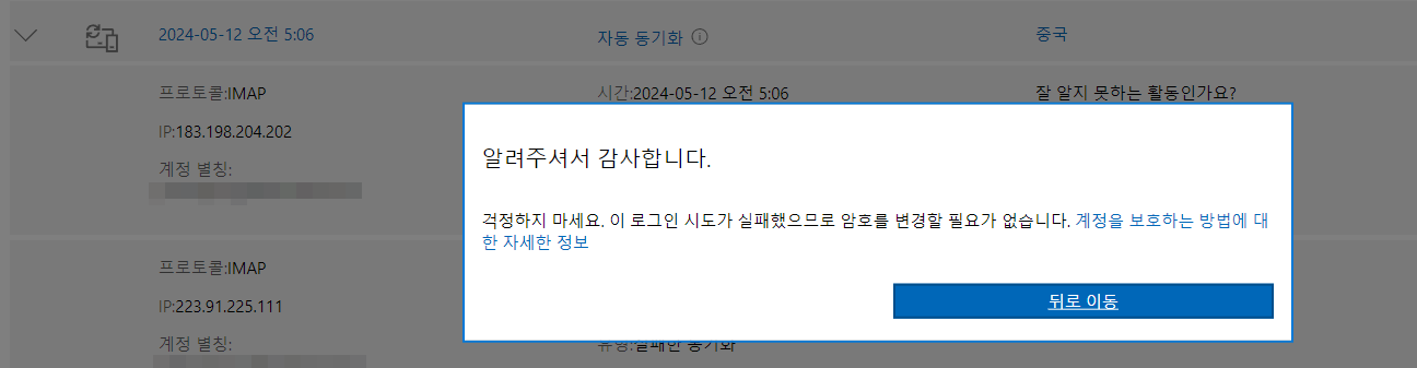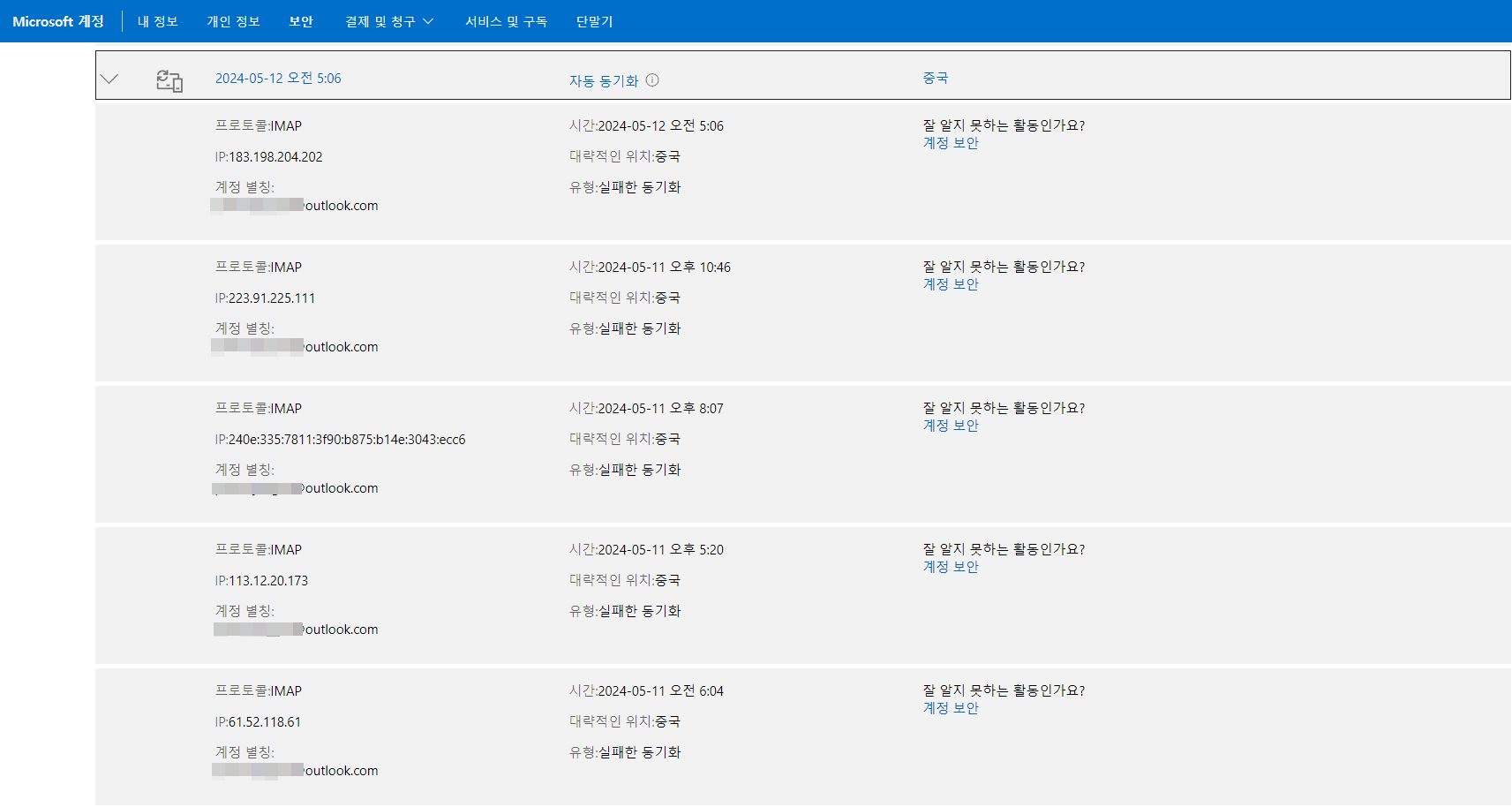 Microsoft 계정 - [보안] - [내 로그인 활동 보기]를 가끔 확인하면 다양한 해킹 시도가 진행되고 있음을 확인할 수 있습니다. "실패한 동기화"는 IMAP을 이용한 해킹 시도, "잘못된 암호 입력"은 무차별 대입을 시도한 해킹 공격으로 예상됩니다.