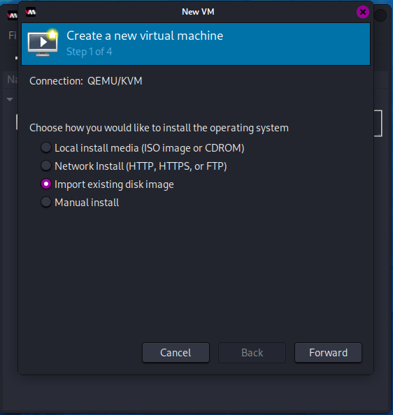 QEMU/KVM - virt manager에서 [Create a new virtual machine] - [Import existing disk image] 메뉴를 선택합니다.