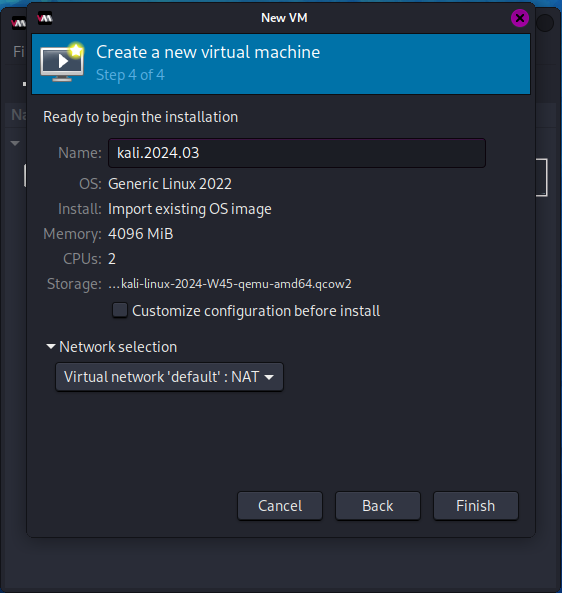표시할 가상머신의 이름을 Kali.2024.03과 같이 알아보기 쉬운 이름으로 지정하고, Network selection 메뉴에서 NAT로 선택되어 있는지 확인합니다.