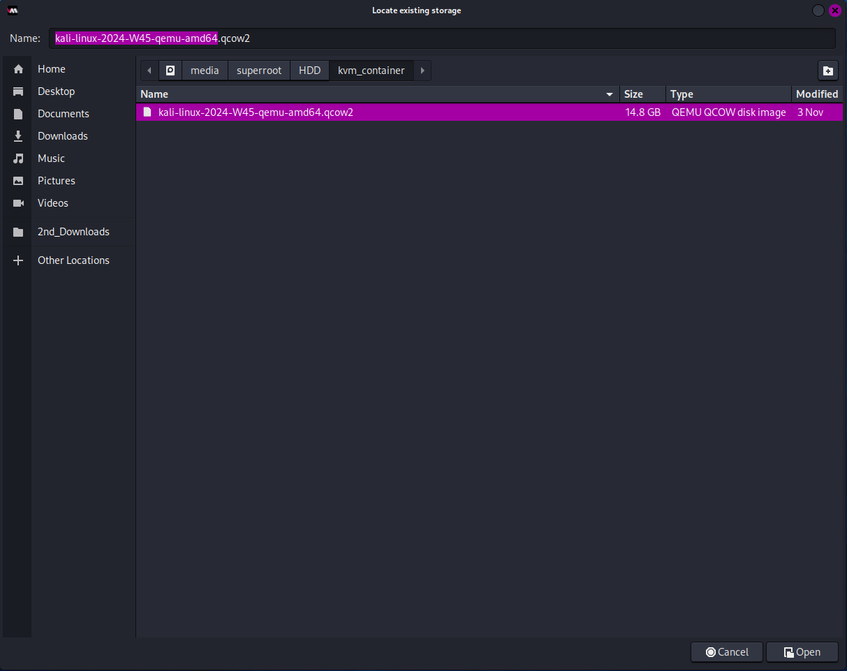 압축을 해제한 kali-linux-2024-WXX-qemu-amd64.qcow2 파일이 있는 디스크를 찾아 선택합니다.
