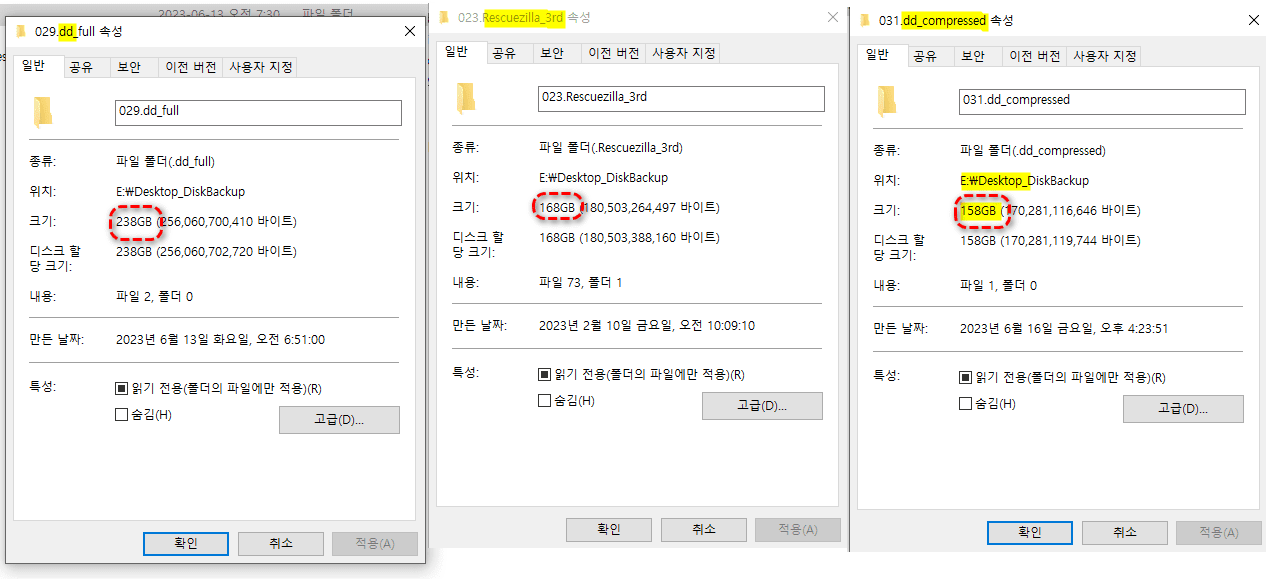 Rescuezilla 표준 압축으로 생성했을 때는 168GB, pzstd로 압축했을 때는 158GB로 파일이 생성됨을 확인할 수 있습니다.