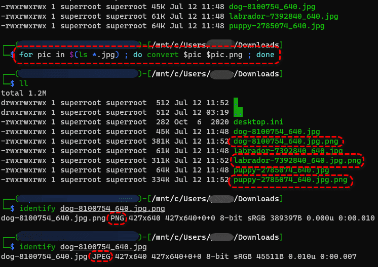 명령어 한 줄을 사용하여 모든 jpg 파일을 png 파일로 변환하였습니다. identify 명령어를 사용하면 이미지의 포맷, 사이즈 등 자세한 정보를 확인할 수 있습니다. 변환된 파일을 확인해 보면 png 포맷으로 변환되었음을 확인할 수 있습니다.