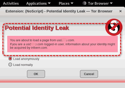 사이트에 나오는 링크를 클릭하자 NoScript 확장 프로그램에서 'Potential Identity Leak' 알림이 나오게 됩니다.