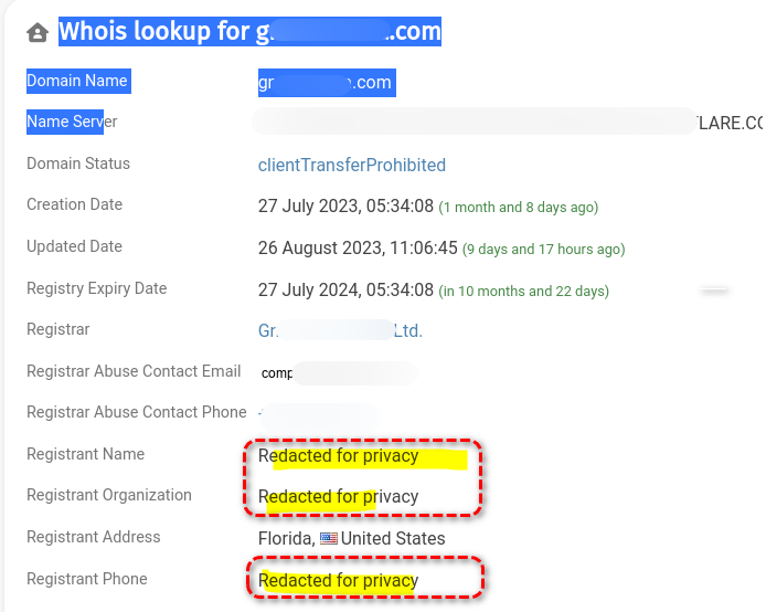 Whois lookup에서는 'Redacted for privacy'와 같이 Privacy를 이유로 Registrant Name, Organization, Phone 등의 정보를 숨기고 있는 경우 위험도가 높습니다.