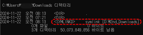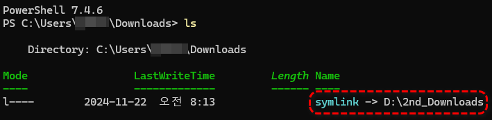 파워쉘에서도 확인할 수 있는데요, ls 명령어 또는 dir을 입력해보면 symlink -> D:\2nd_Downloads와 같이 화살표를 사용해서 symlink가 D:의 2nd_Downloads와 연결되어 있음을 알 수 있습니다. 화살표가 좀 알기 쉽죠.