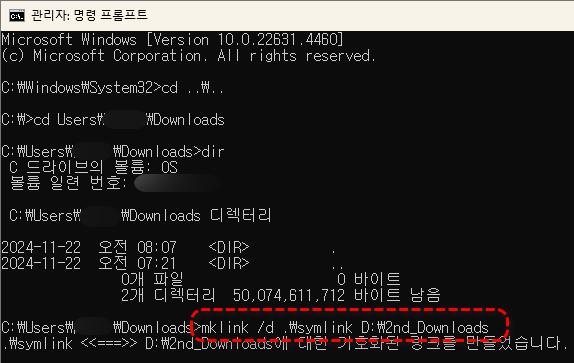 그리고 뒤에 D:2nd_Downloads 를 symlink 디렉토리에 심볼릭 링크를 시킨다는 의미입니다.