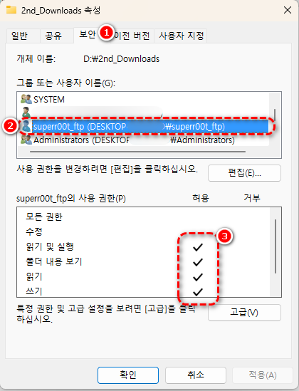 내부에 저장된 파일을 다운로드 할 수 있습니다. 만약 쓰기 권한까지 사용하려면 2nd_Downloads 폴더에 ftp 사용자 권한을 추가해줘야 합니다.