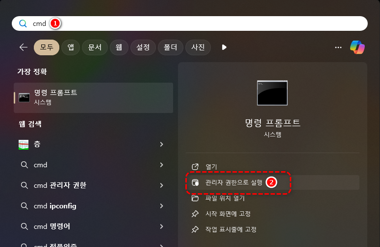 따라서 윈도 - 검색에 cmd를 입력하여, 명령 프롬프트를 관리자 권한으로 실행합니다.
