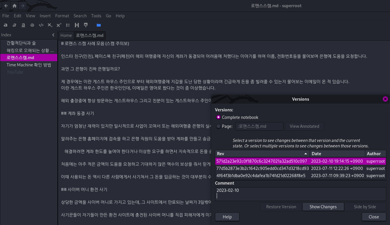 cloud 공간이 불안하고 자신의 컴퓨터 공간에만 보관하고 싶은 경우, linux의 zim desktop + git을 활용할 수 있습니다. git의 version 관리 기능을 활용하여 문서를 관리할 수 있습니다.