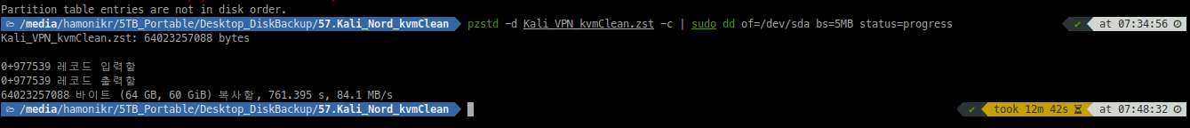복원을 시켜봤는데 총 12분 42초 정도 걸렸네요. dd는 운영체제에 상관없이 디스크/파티션을 다 백업하여 복원할 수 있습니다. 이 명령어를 사용하시면 다른 유료 백업 프로그램이 전혀 필요 없을 정도로 유용하게 사용하실 수 있을 것입니다.