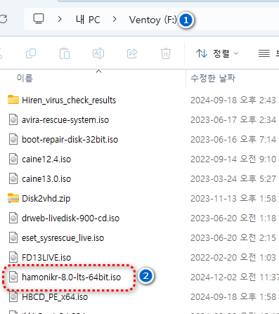 USB Drive를 Ventoy 프로그램으로 부팅용 USB로 생성합니다. 그 이후 Ventoy USB에 hamonikr-8.0-lts-64bit.iso 파일을 복사해 줍니다.