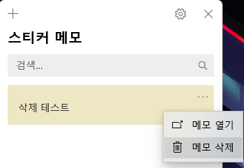 삭제된 스티커 메모의 복구를 위해, 샘플 메모를 먼저 삭제합니다. 메모 삭제는 메모 오른쪽에 있는 점 3개를 눌러 [메모 삭제]를 눌러 삭제할 수 있습니다.