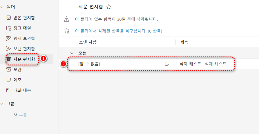 다만, 지운 편지함의 경우 30일이 지난 파일들은 지워지게 됩니다. 안타깝지만 30일이 지난 메모는 복구할 수 없어요.