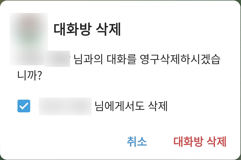 대화방 삭제 시에도 대화 상대방 대화방도 삭제하는 옵션에 체크하여 대화방을 삭제합니다.