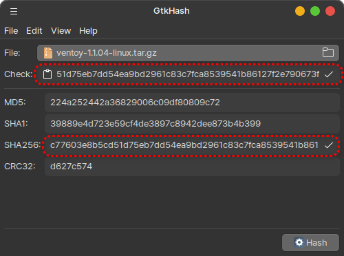최신 release 파일 중 리눅스용 ventoy-x.x.x.x-linux.tar.gz 파일을 다운로드합니다. 그리고 checksum을 확인하기 위해서 gtkhash 프로그램을 사용하여 SHA256 값이 일치하는지 확인합니다.