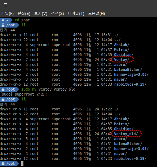 최신 update를 위해 mv 명령어를 사용하여 Ventoy 디렉터리를 Ventoy_old로 바꿔줍니다.