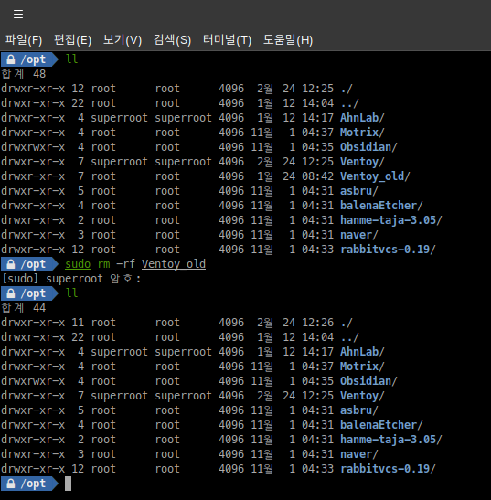 Ventoy_old 디렉터리를 제거하려면 sudo rm -rf Ventoy_old 명령어를 사용하여 삭제하실 수 있습니다. 프로그램 update 후 아무런 문제가 없다는 것을 확인하고 삭제하시는 것을 추천합니다. (가장 마지막 단계에 실행하는 것 추천)