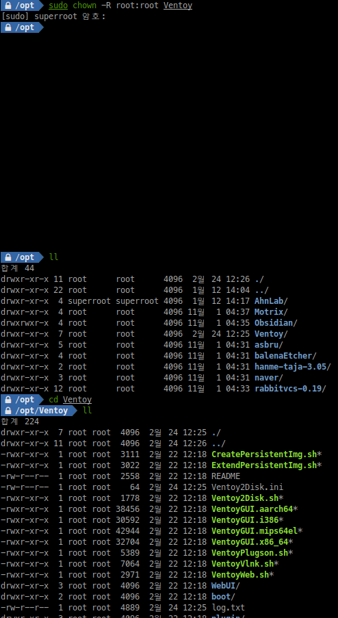 그리고 복사한 파일들의 소유권을 바꿔주기 위해서 sudo chown -R root:root Ventoy 명령어를 실행합니다.