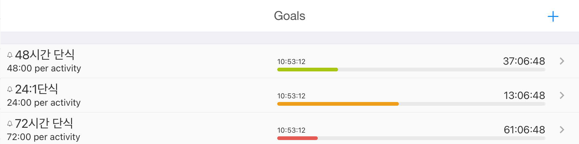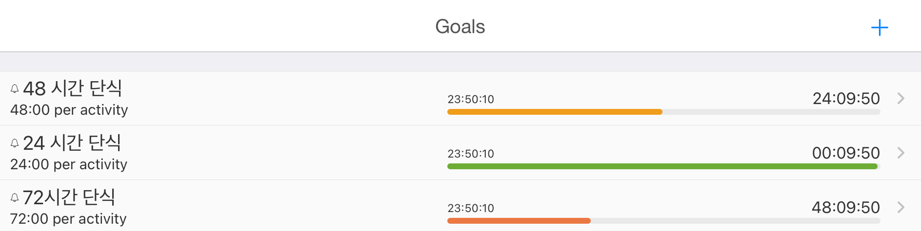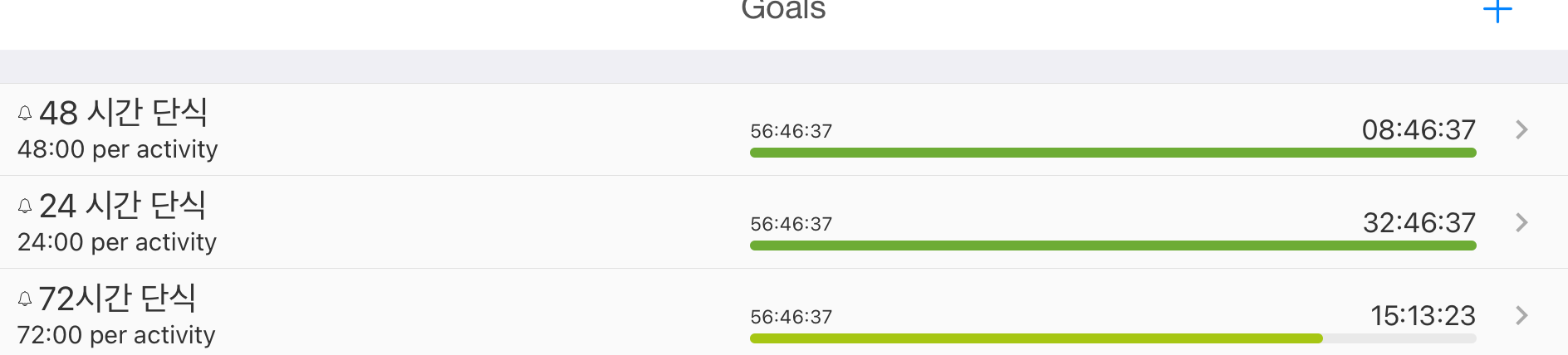 단식 시간 확인을 위해서 iPad 앱 aTimeLogger에 72 시간 목표를 설정하고, 1일차, 2일차, 3일차 각각 알림이 오도록 설정했습니다.
