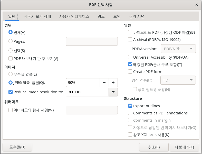 PDF 선택 사항 메뉴가 나타납니다. 여기에서 JPEG 압축 품질(기본값 90%), Reduce image resolution to (기본값 300 DPI) 부분을 수정해서 용량을 줄일 수 있습니다.