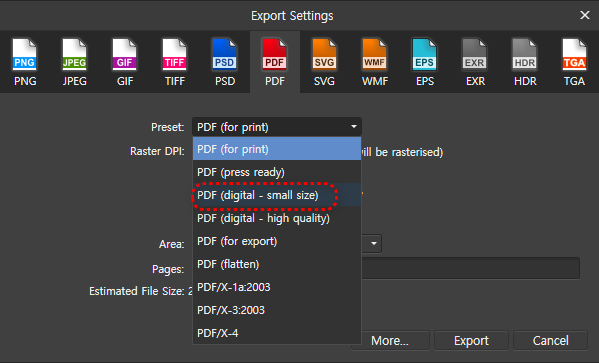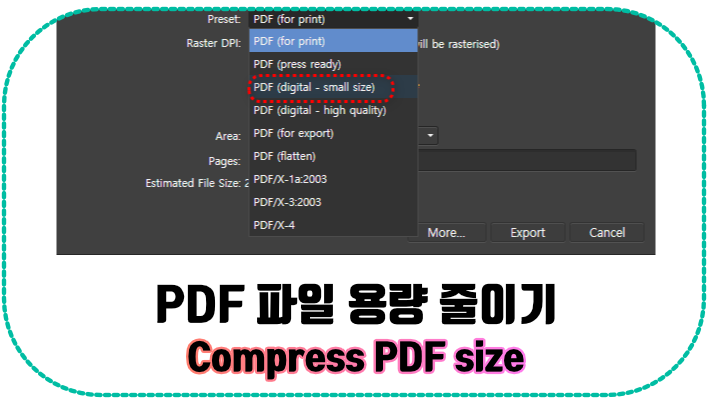 Export Settings 메뉴가 나오면, Preset에서 PDF(digital - small size)를 선택하고 Export를 진행합니다.