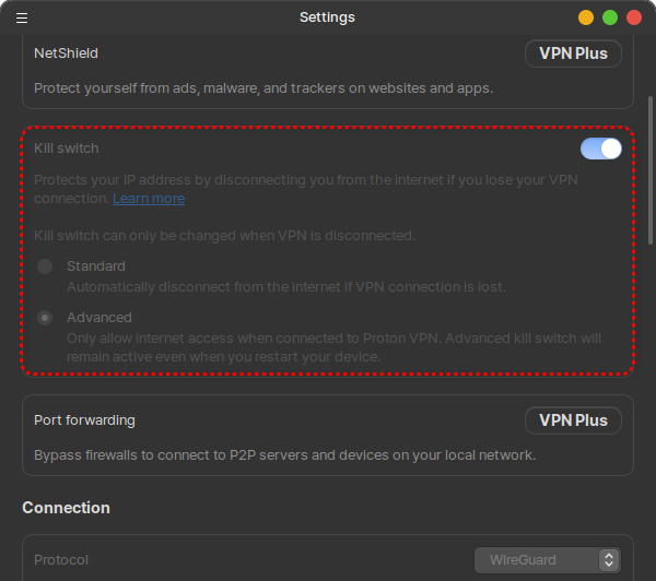여기에서 가장 중요한 Kill switch 메뉴를 활성화시켜 줍니다. 활성화시켜주고 Advanced로 바꿔줍니다. 이 설정으로 바꾸게 되면 protonvpn으로 서버에 연결을 해줘야 인터넷이 사용 가능하게 됩니다. vpn 연결이 끊어지게 되면 모든 인터넷 연결도 함께 끊어지게 되어 사용자의 IP가 노출되는 경우를 방지해 줍니다.