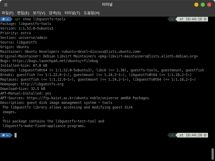sudo apt-get install libguestfs-tools 명령어를 사용하여 패키지를 설치합니다.
