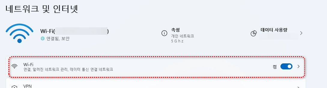 네트워크 및 인터넷 메뉴에서는 Wi-Fi를 연결해서 사용하는 경우, Wi-Fi 메뉴를 선택합니다.