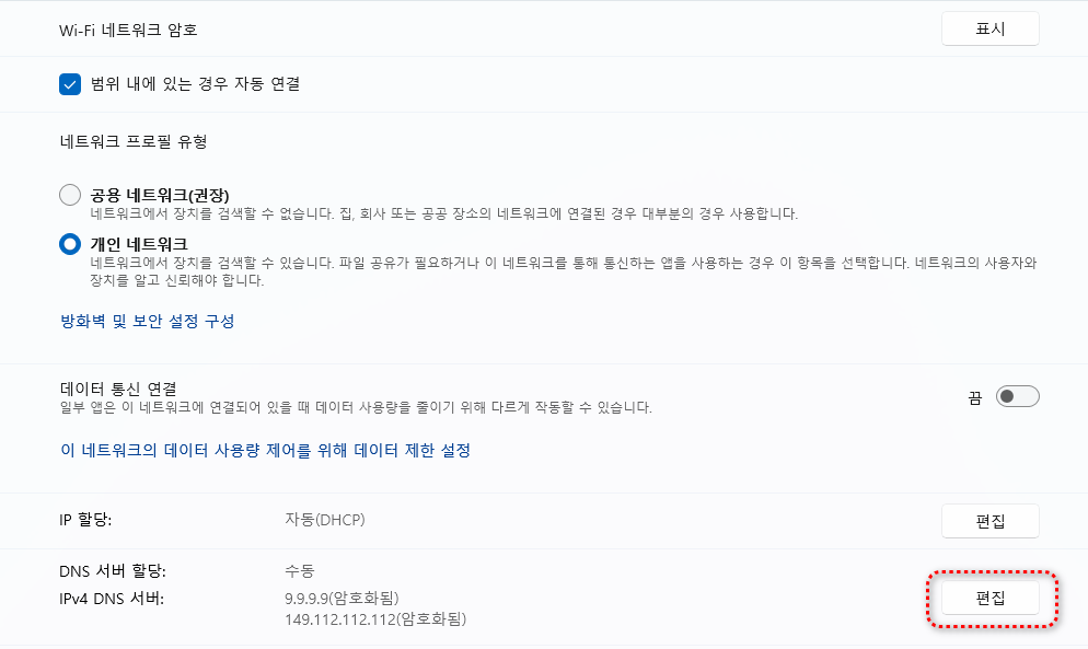 기본 설정 DNS와 대체 DNS 메뉴에 자신이 원하는 DNS 서버의 IP 주소를 입력하고, 해당 DNS 서버에서 HTTPS를 통한 DNS 서비스를 지원하는 경우 "켜기(자동 템플릿)" 로 설정해 줍니다.