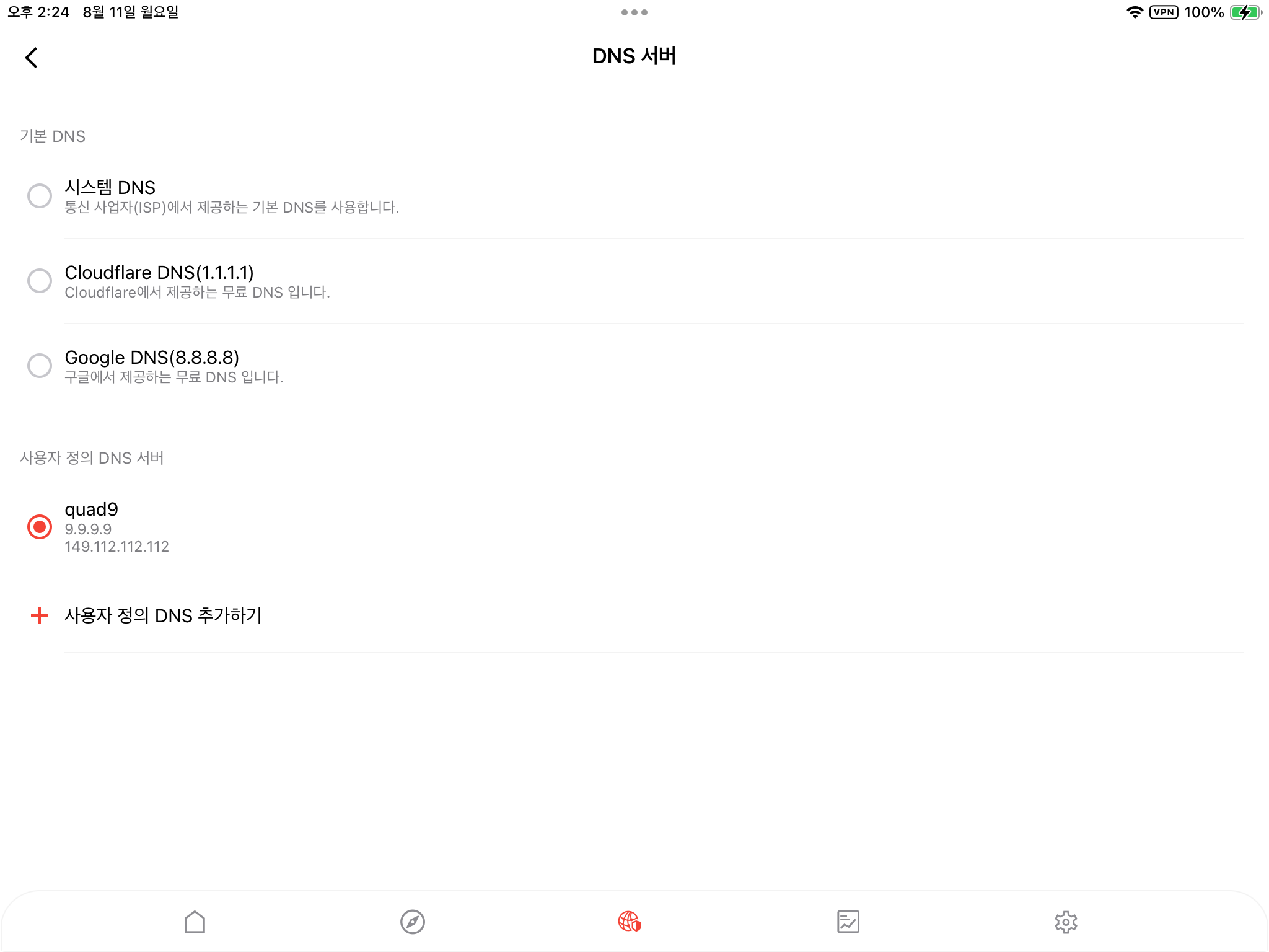 유니콘 Pro에는 Google DNS, Cloudflare DNS 2개의 추가 서비스를 선택할 수 있습니다. Quad9과 같은 별도의 서버를 추가하려면 [사용자 정의 DNS 추가하기]를 선택하고 9.9.9.9, 149.112.112.112와 같이 입력(한 줄에 입력 시 , 로 구분)하거나 기본 DNS(9.9.9.9), 대체 DNS(149.112.112.112)를 각각 다른 줄에 입력하여 설정할 수 있습니다.